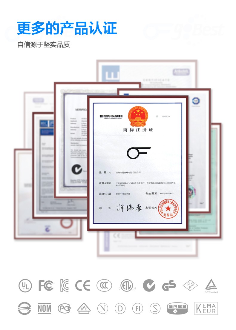 • 產(chǎn)品通過(guò)CCC,UL,CUL,CE,KC,GS,F(xiàn)CC,SAA,PSE,MEPS等安規(guī)認(rèn)證.產(chǎn)品完全符合ROHS標(biāo)準(zhǔn)